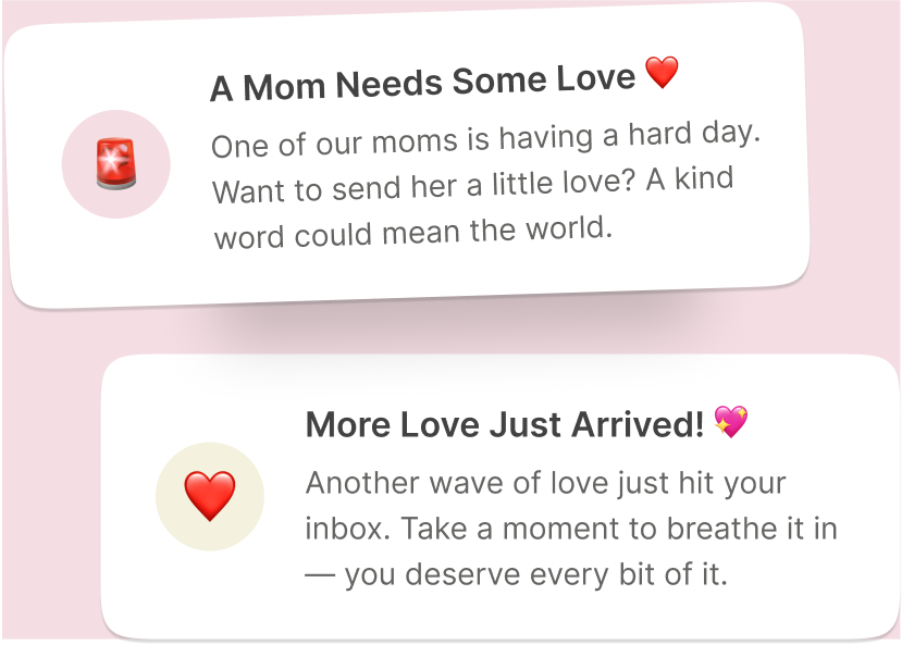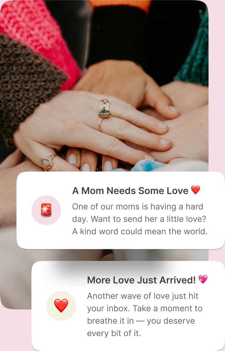 Need encouragement at 3 AM? Request a “Love Bomb” and receive heartfelt support from the motherhood community within minutes